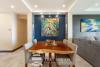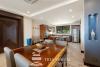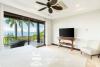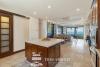 The chef’s kitchen is equipped with GE Profile stainless steel appliances, granite countertops, and a large breakfast island—perfect for morning coffee or entertaining guests. The kitchen flows seamlessly into the expansive living and dining area, which opens onto a generous ocean-view terrace through oversized sliding glass doors.